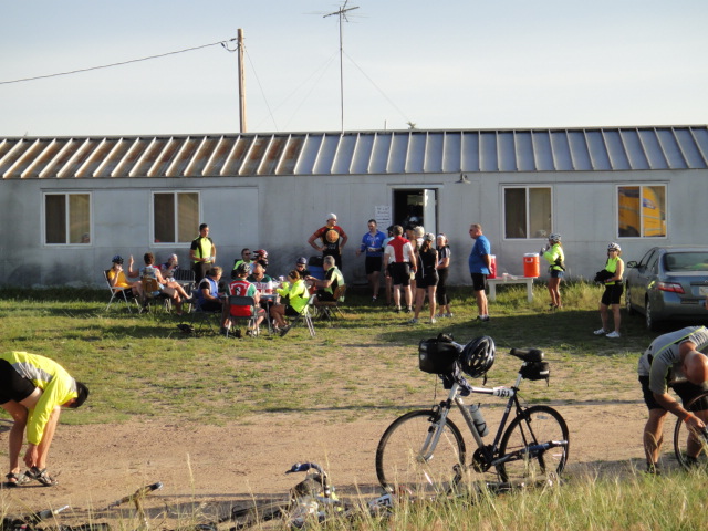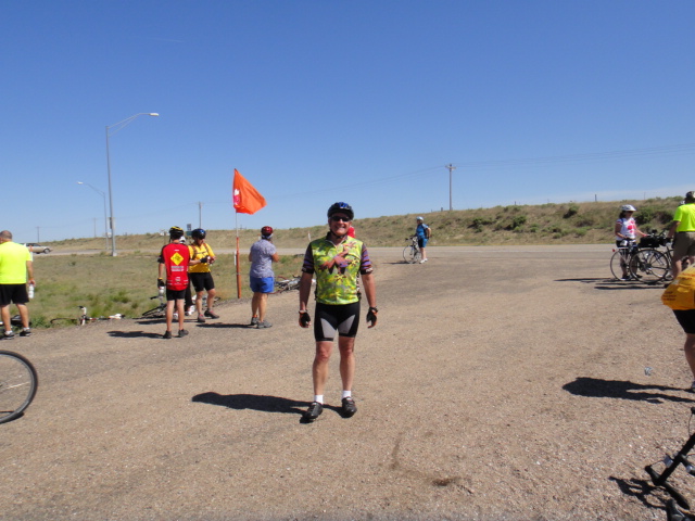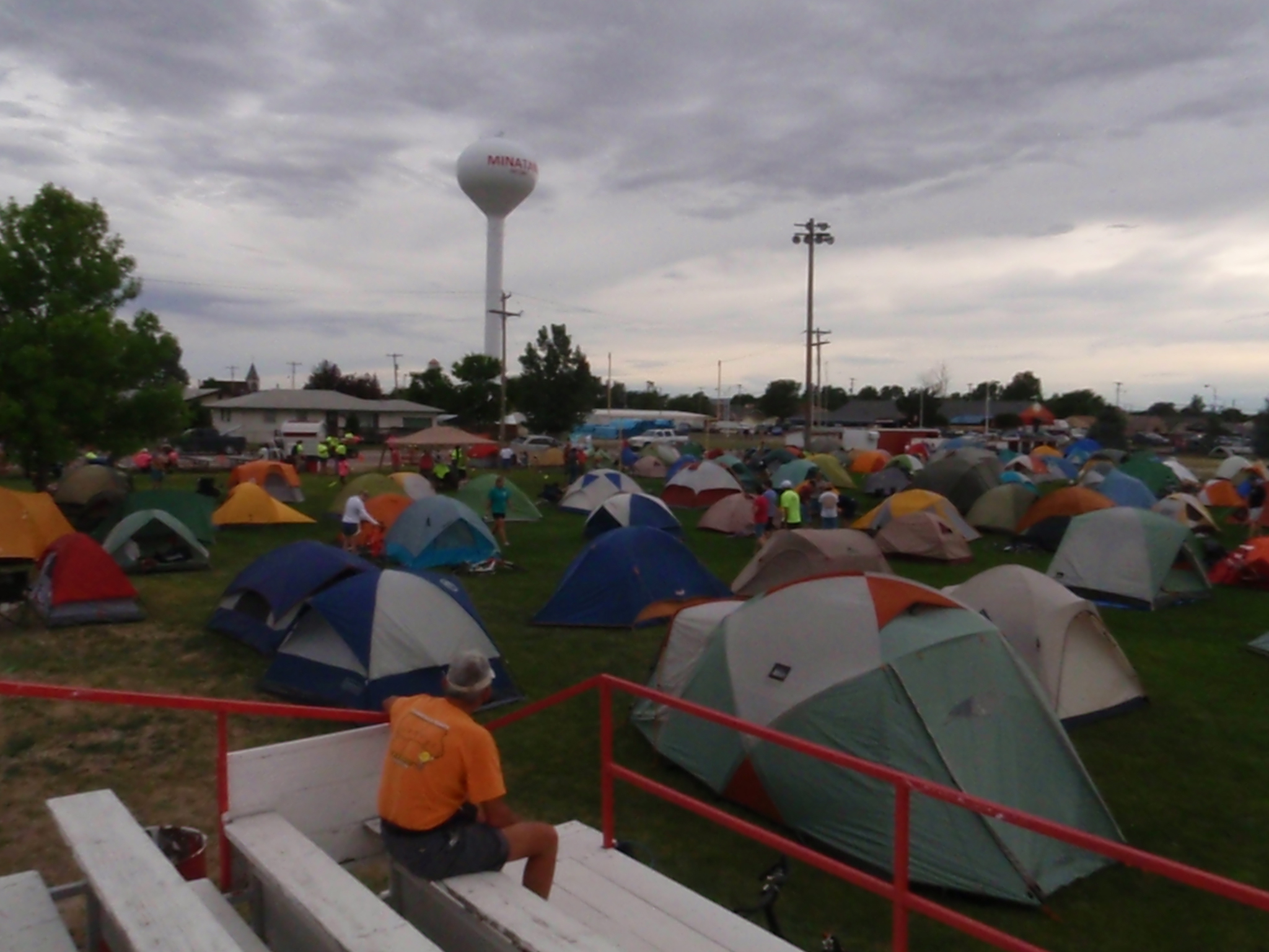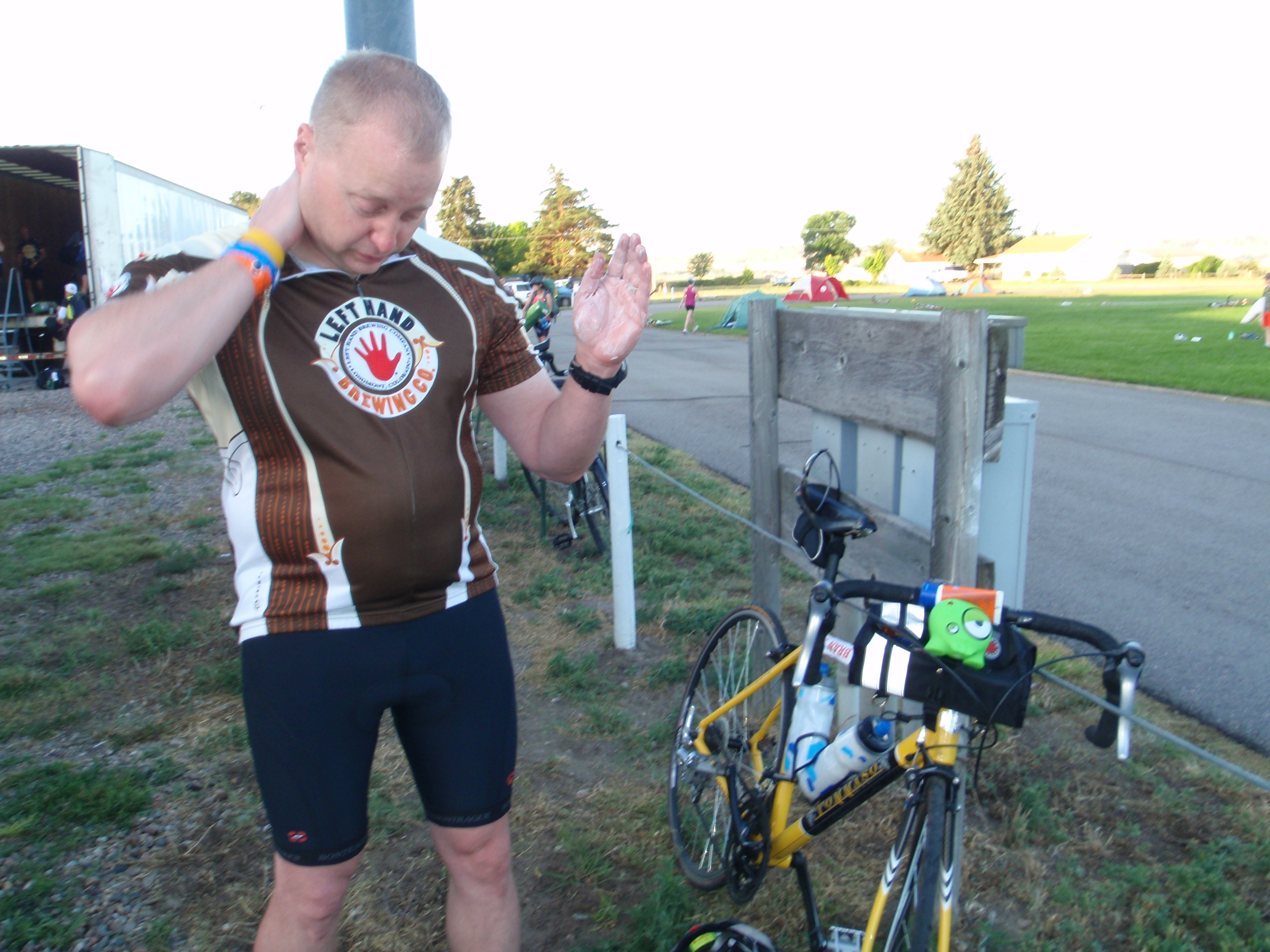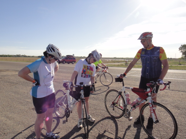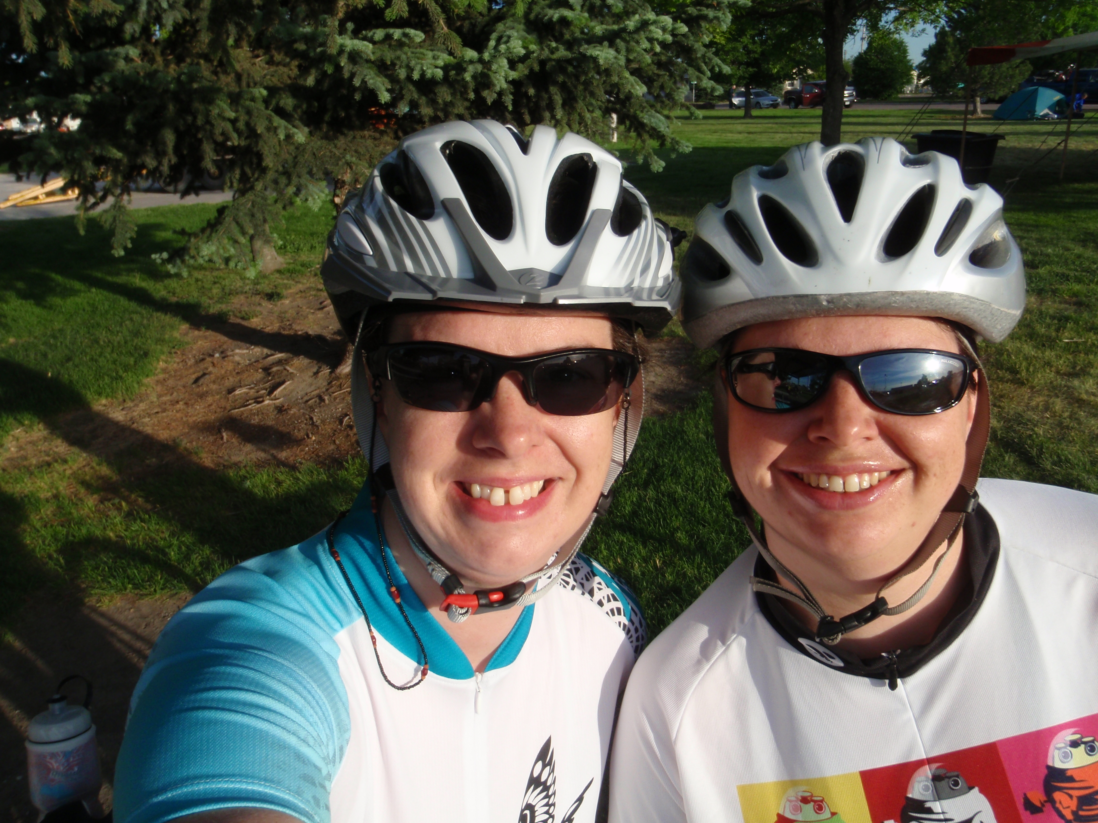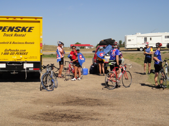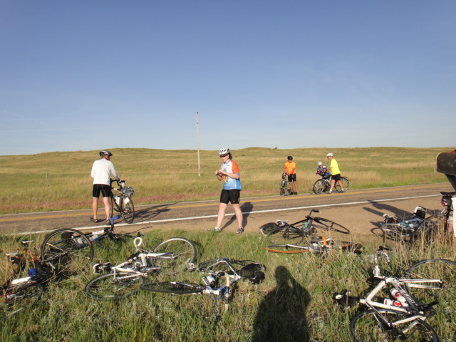 Day 1: Â the longest day….over 70 miles. Â (my longest ride ever in my life was just over 30…and I was miserable all but 2 miles of the 30….so 70+ was a little ridiculous, even in my book) Â I got dehydrated to the point of a complete mental breakdown. Â On.Day.One. for crying out loud. Â The temperature was over 100, we’re in the middle of Nebraska where they don’t believe in trees, it’s windier than h*ll, I’m so pale you can’t tell the difference between my legs and the white socks I’m wearing……and we’re out on bikes. Â I did not pee once the entire day….and I was drinking water like crazy. Â That’s how dehydrated I started out.